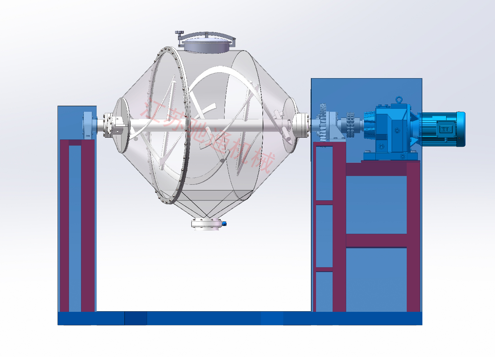SYD型雙運(yùn)動(dòng)混合機(jī)由料桶、機(jī)架、減速傳動(dòng)、攪拌葉片等構(gòu)成。該機(jī)的工作過(guò)程是:把需混合的幾種物料通過(guò)真空輸送或人工加料投放到水平雙錐體內(nèi),上好筒蓋,開(kāi)起設(shè)備,雙錐筒及攪拌葉片同時(shí)轉(zhuǎn)動(dòng),旋轉(zhuǎn)的雙錐筒使筒體內(nèi)物料產(chǎn)生紊亂翻滾混合,高速旋轉(zhuǎn)的攪拌葉片打碎結(jié)團(tuán)物料,使物料在筒體內(nèi)快速混合。SYD型雙運(yùn)動(dòng)混合機(jī)工作過(guò)程無(wú)死角,無(wú)沉積,可使混合的物料快速達(dá)到均勻一致的效果。